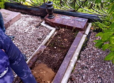 Далее приступаем к установке подставки памятника. После того, как она была возвращена на своё место, размечаем цветник. Параллельно работаем с периметром могилы: по краю пускаем металлическую планку, которая послужит границей брусчатки.